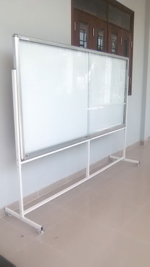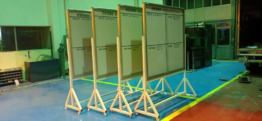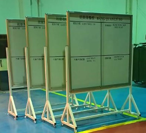 Khung chân bảng di động được làm băng sắt sơn tĩnh điện màu trắng sữa. Cấu tạo của khung chân được thiết kế lắp cố định bằng sắt dày 1,2 ly sắt vuông 40x40mm và có hệ thống bánh xe Taiwan giúp cho bảng di chuyển và gài cố định.