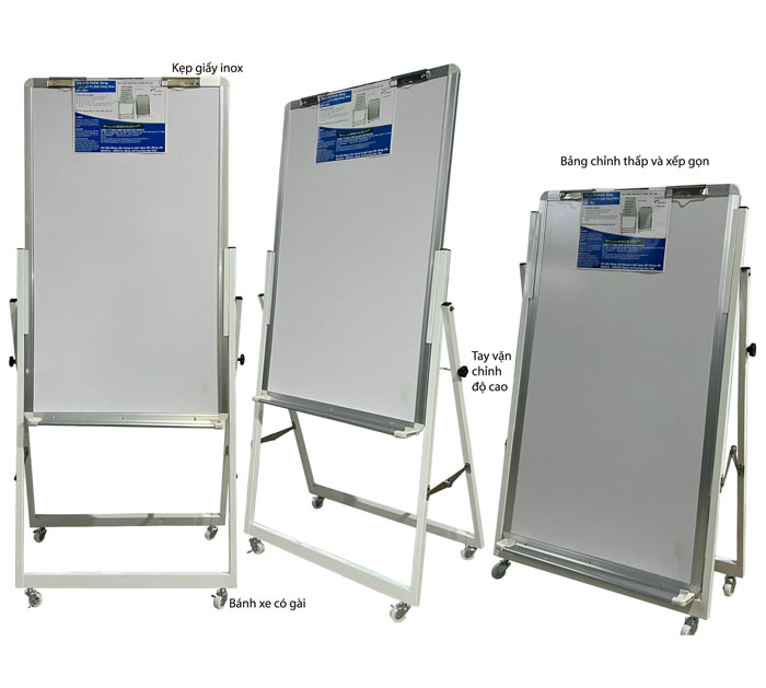 5. Chân bảng: bằng sắt kẽm chốt rỉ, sơn tĩnh điện màu trắng chống trầy. Chân bảng có gắn 4 bánh xe Taiwan có gài di chuyển và cố định dễ dàng. Điều chỉnh độ cao và xếp gọn được.